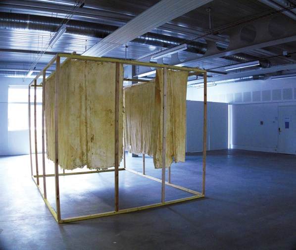Un moulage intégral. En appliquant plusieurs couches successives de latex sur le mur d’une salle j’en prélève l’empreinte. Les traces de plâtre et d’humidité, la peinture, ont adhérés au matériau. Demeure un témoignage, à un instant donné, de la mémoire d’un lieu.