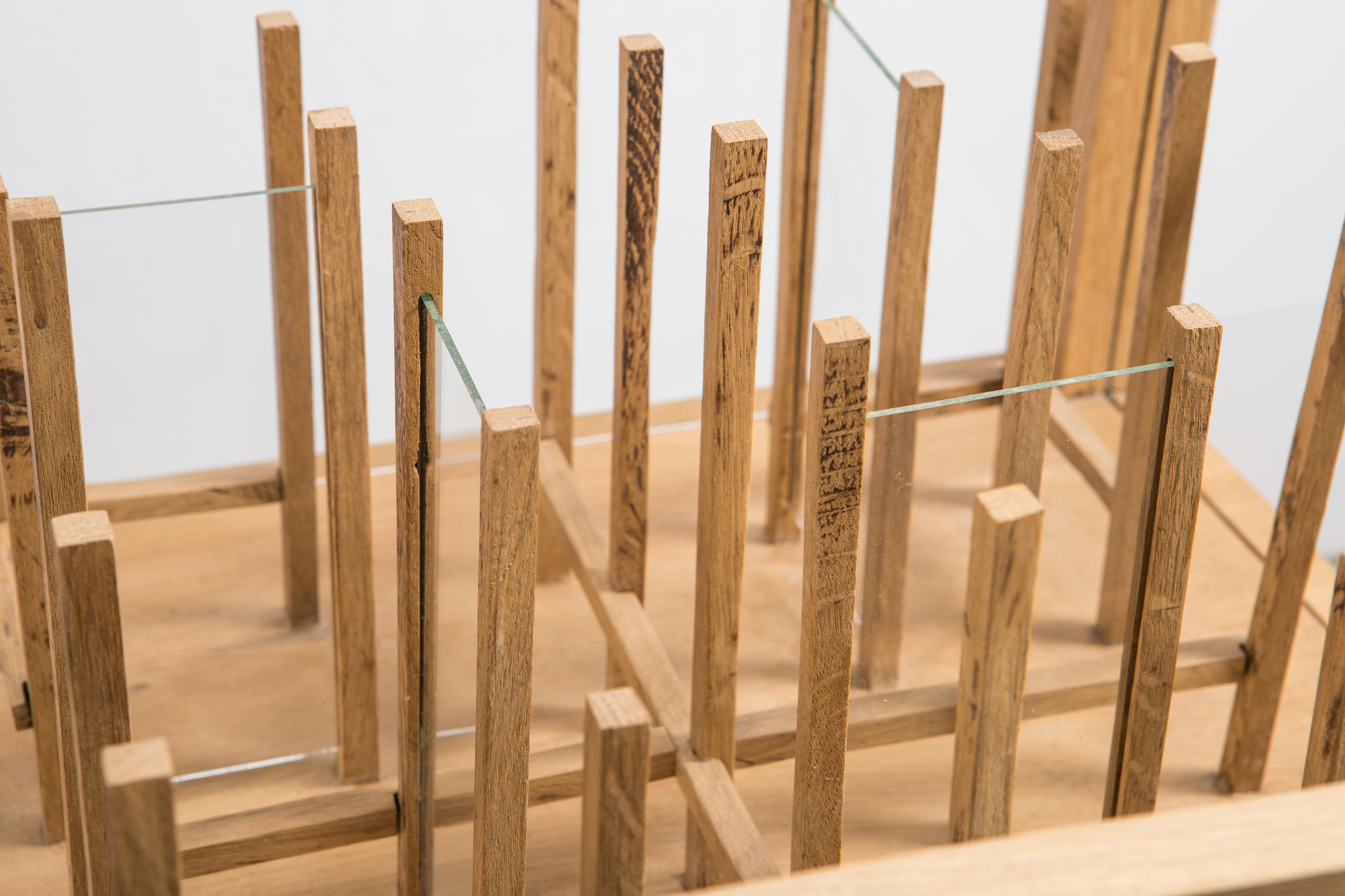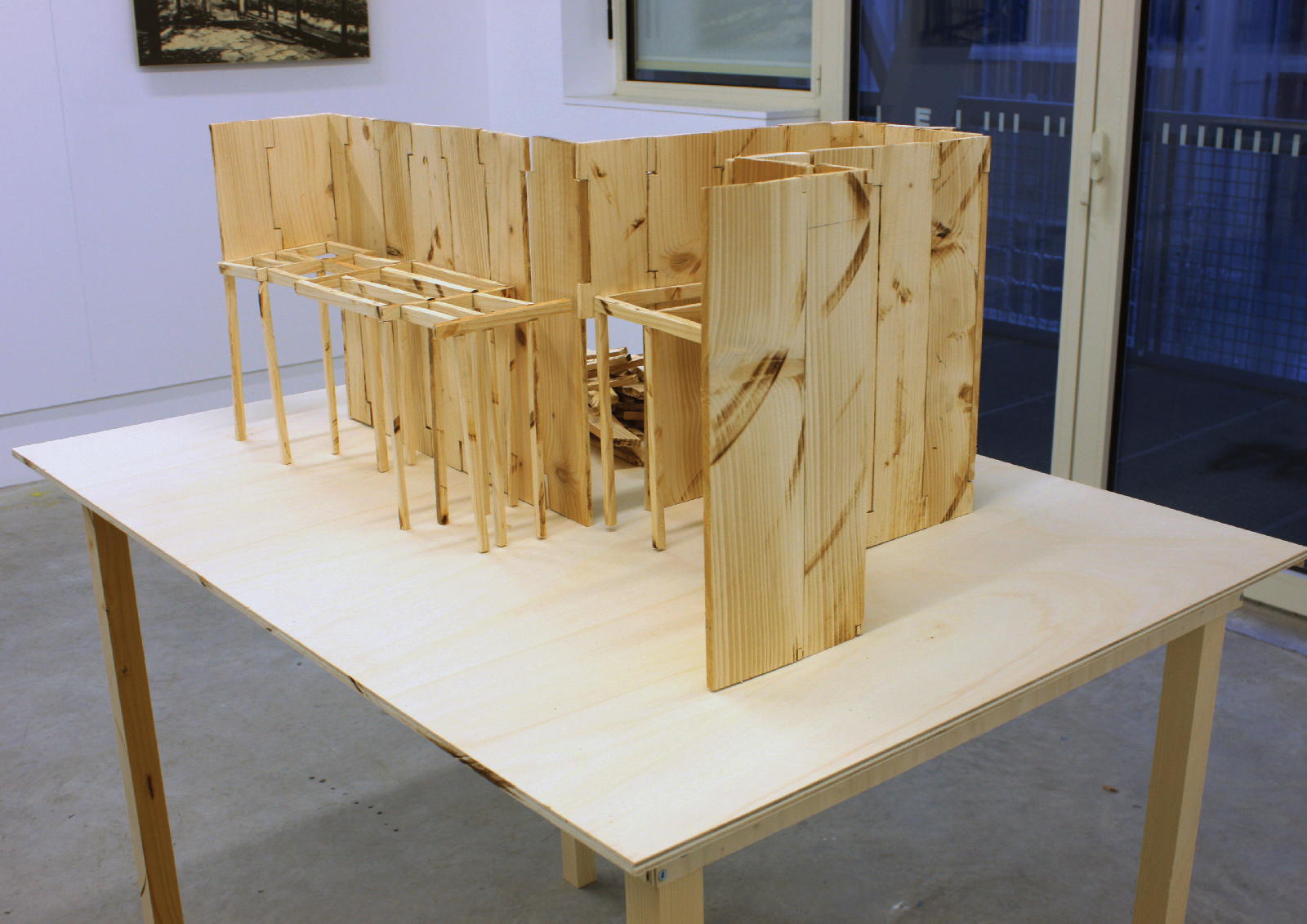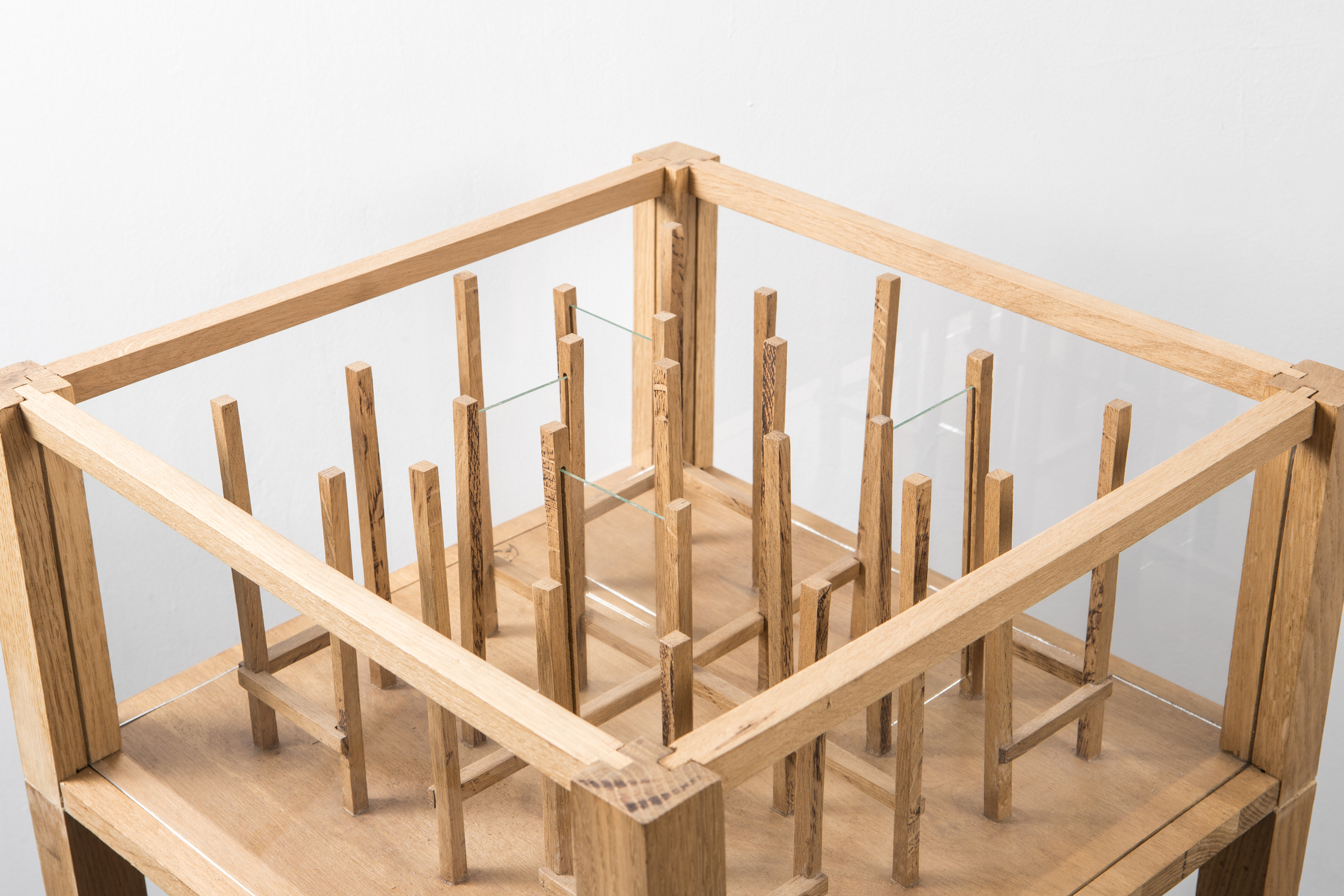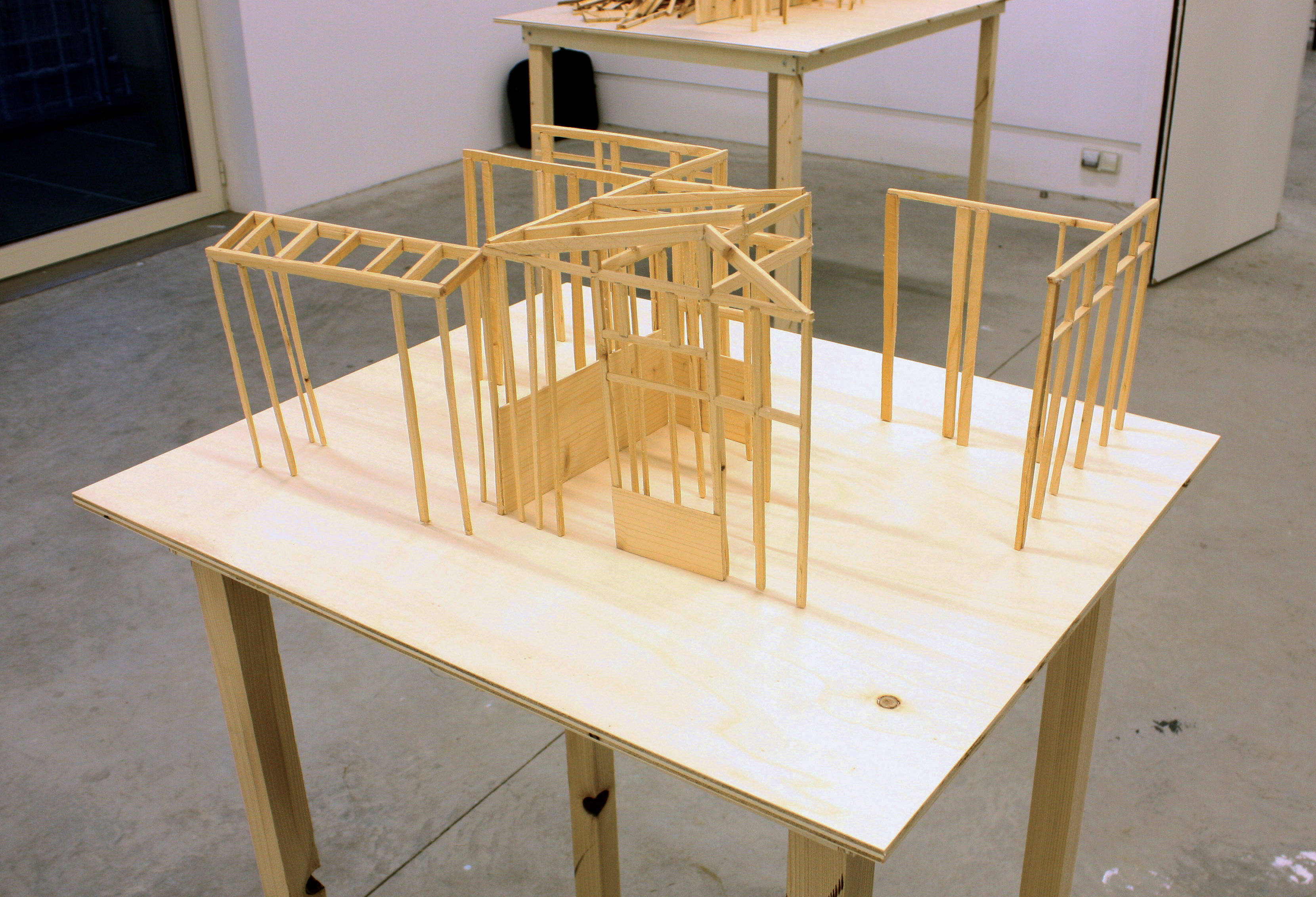 Les modèles se réfèrent à des archétypes de structure que l’on peut croiser au quotidien. A partir de certains détails caractéristiques prélevés je produis une structure autonome qui vient adhérer à l’espace environnant. En réaction l’espace s’intègre par des jeux de reflets et de perspective au modèle, produisant à chaque présentation une proposition sensiblement différente. A chaque modèle correspond une table, prolongement et partie intégrante de l’ouvrage, reposant sur l’espace de sa présentation.