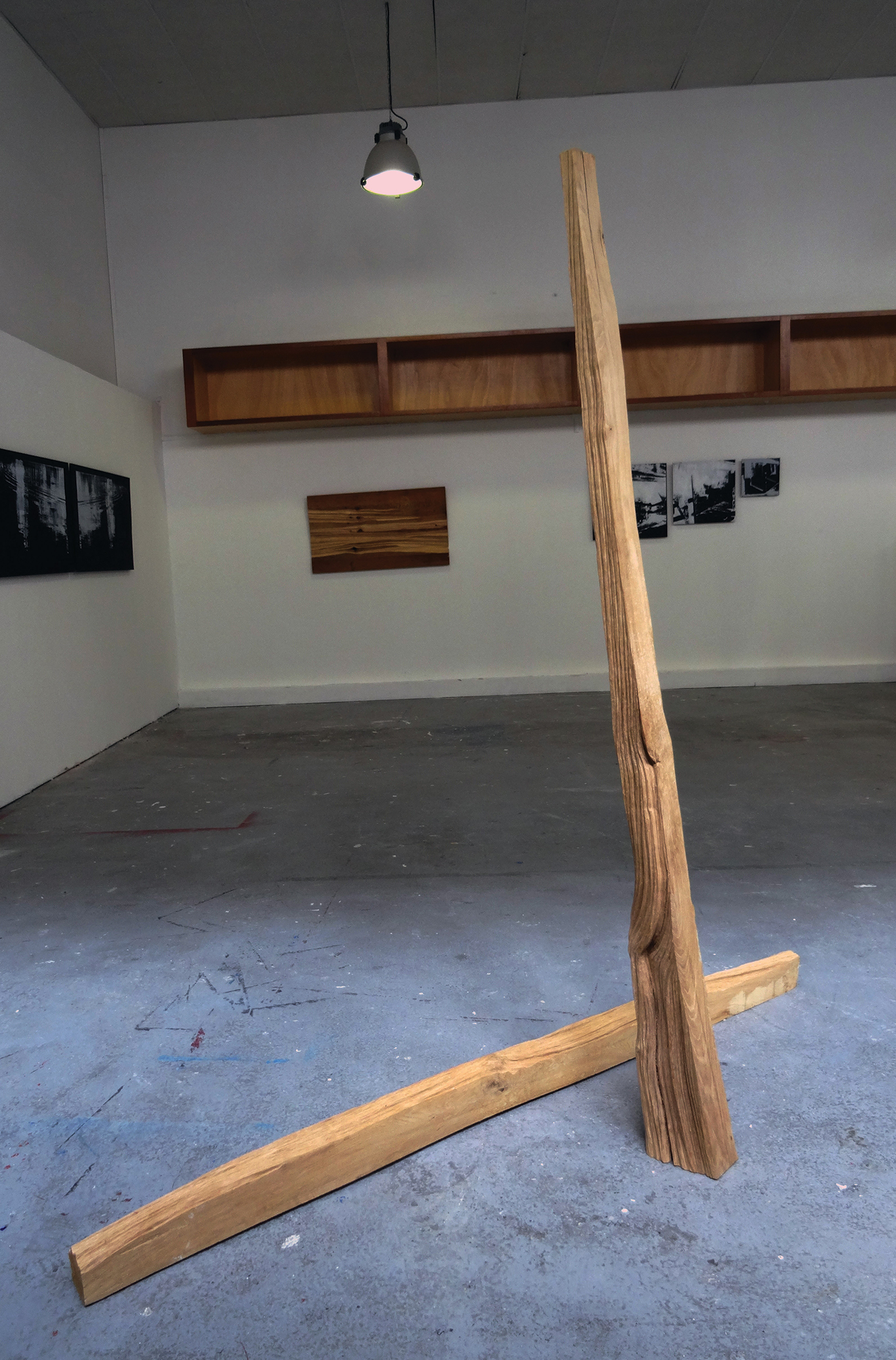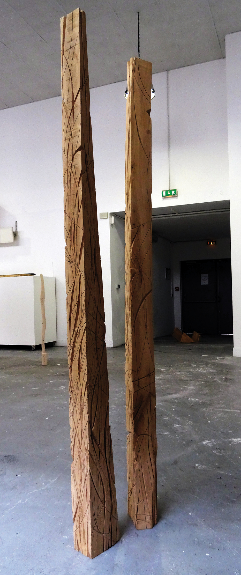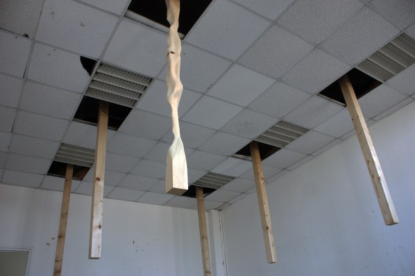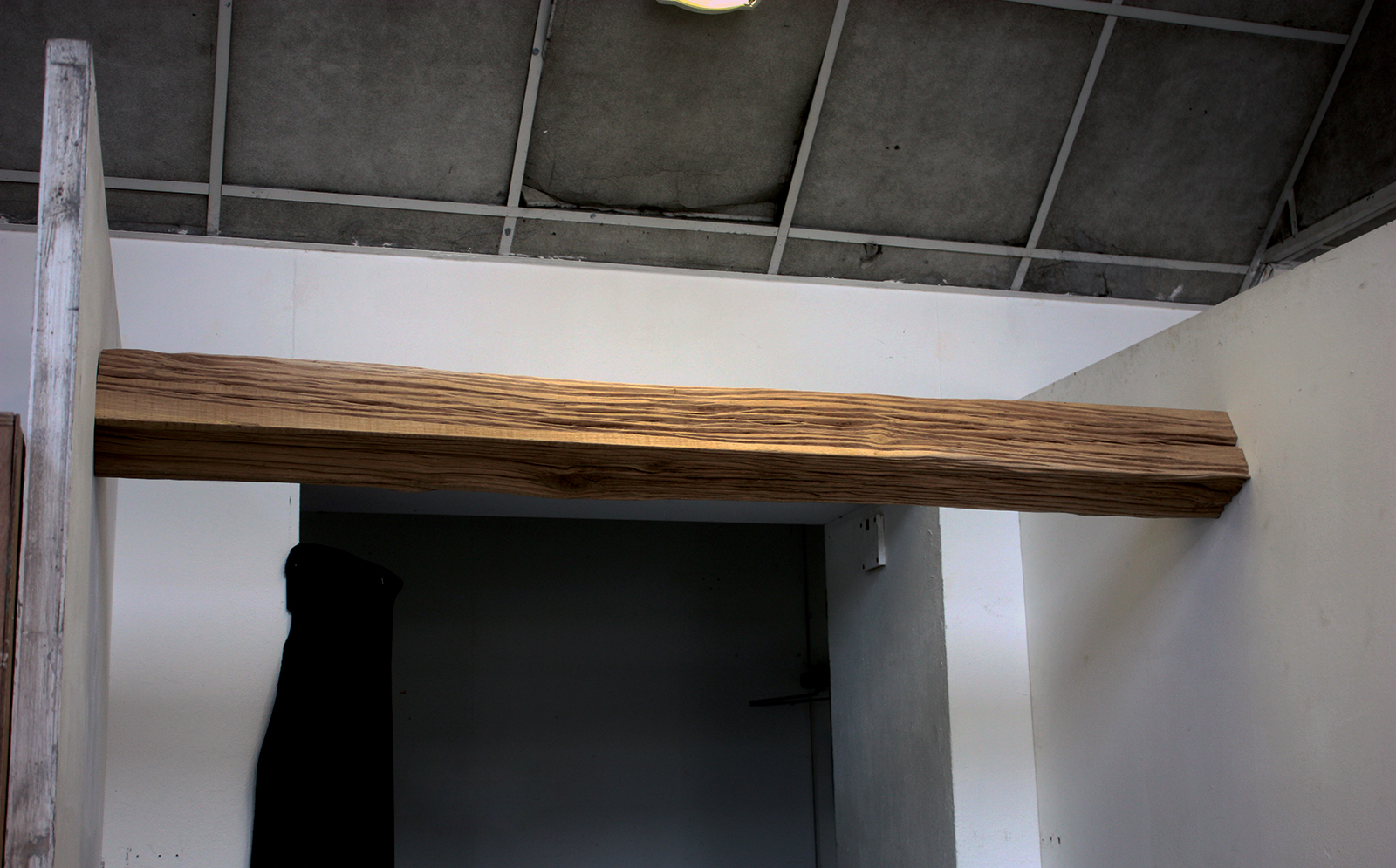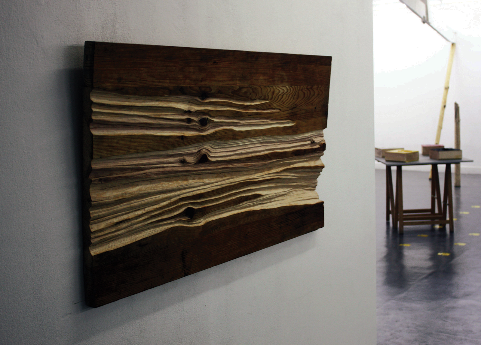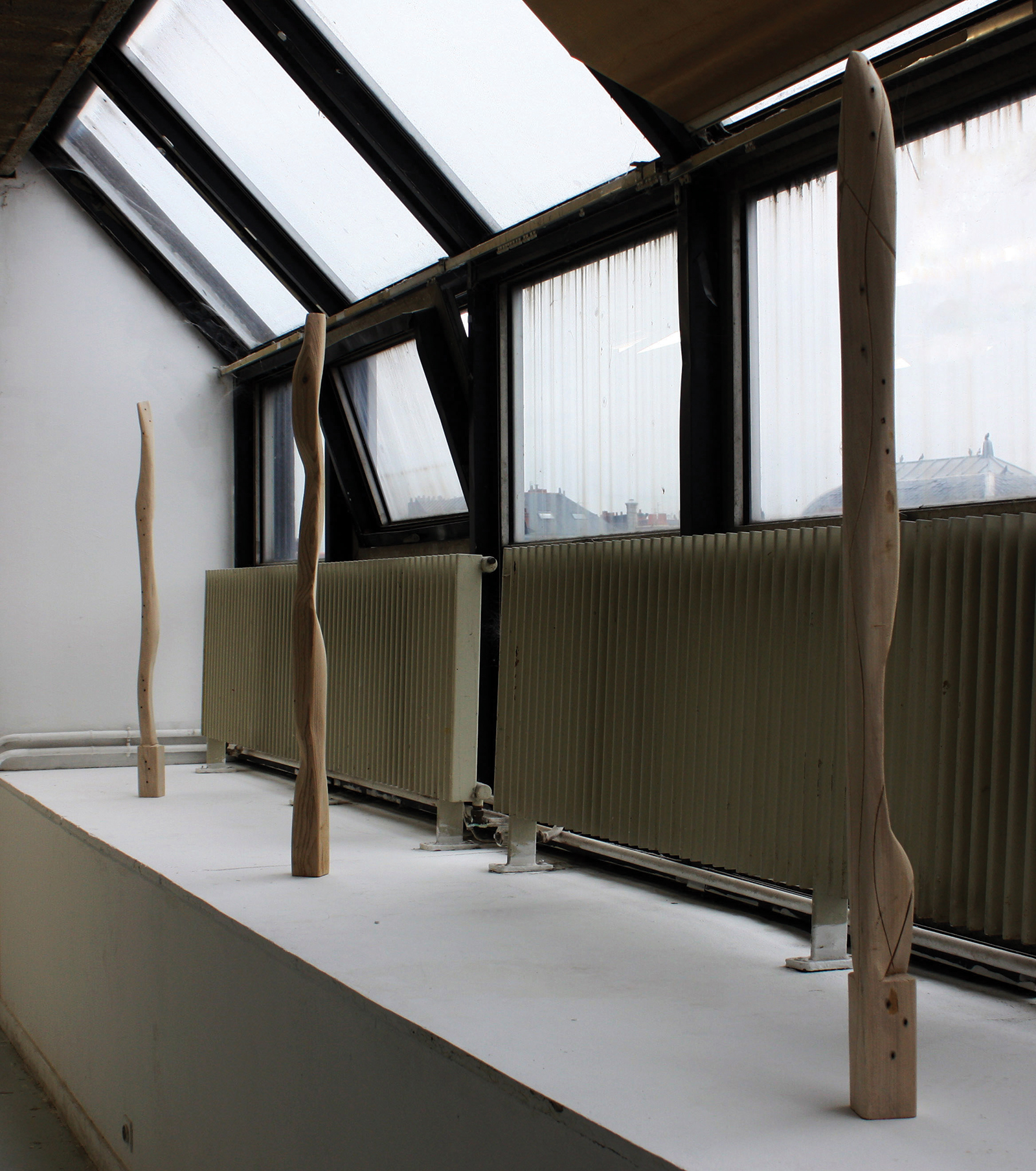 Je suis parti d’un volume de matière, des pièces en bois creusées à l’aide d’un ciseau. En suivant les lignes du bois, en faisant reparaître les fibres qui le constitue, je produisais un sillage à la rencontre des abords de la surface lisse de la charpente. Placés dans l’espace, elles tentent de se maintenir au seuil de la structure du lieu qui les accueille.