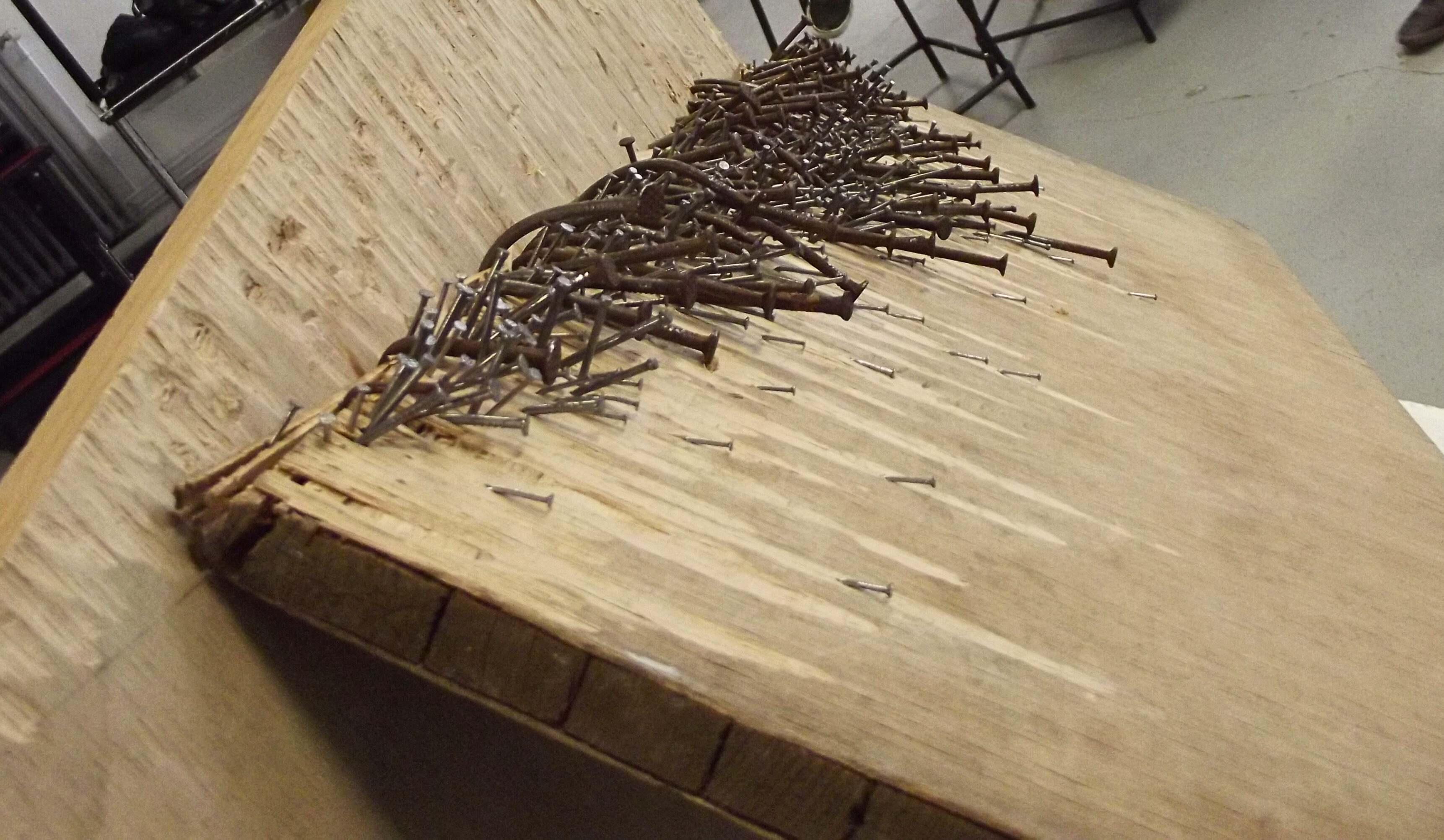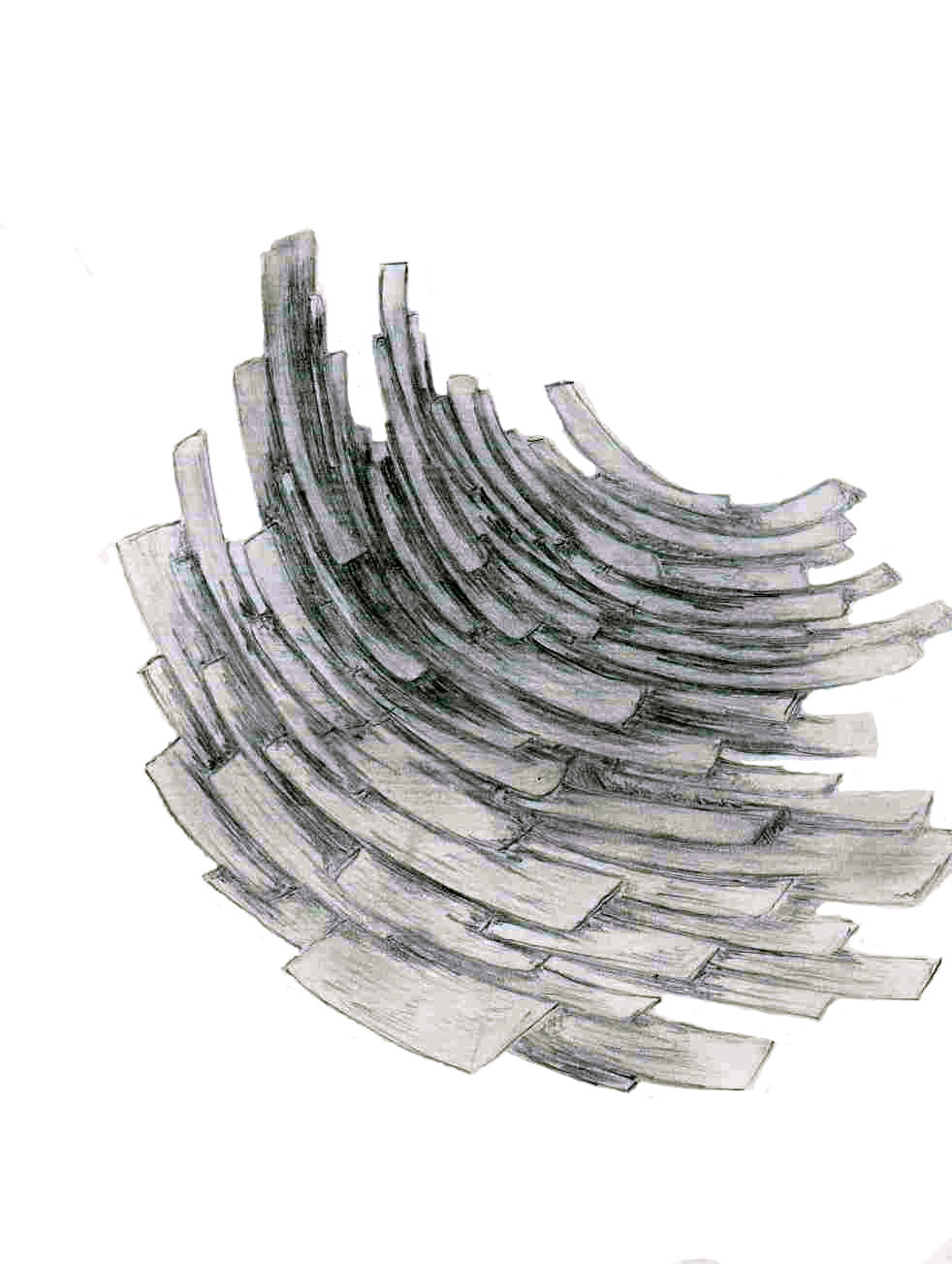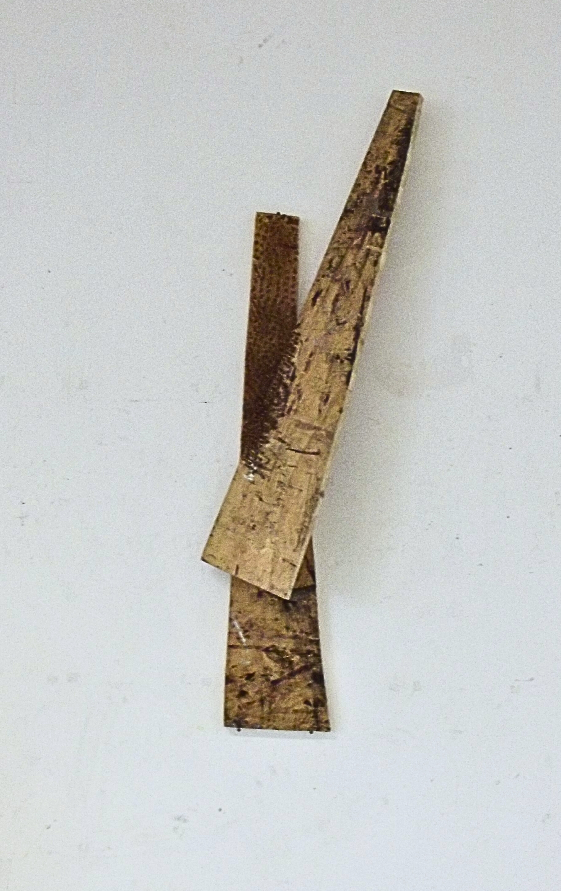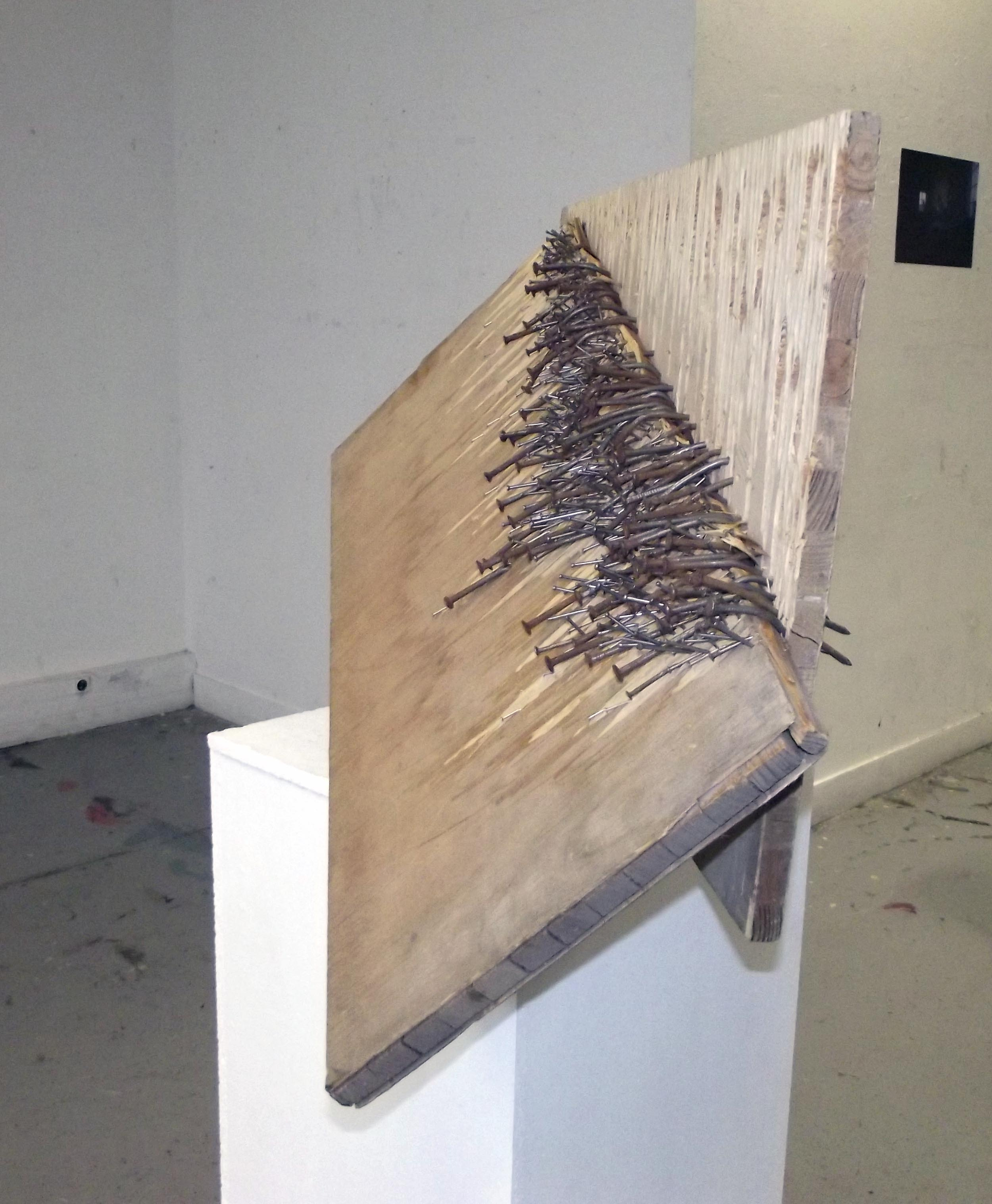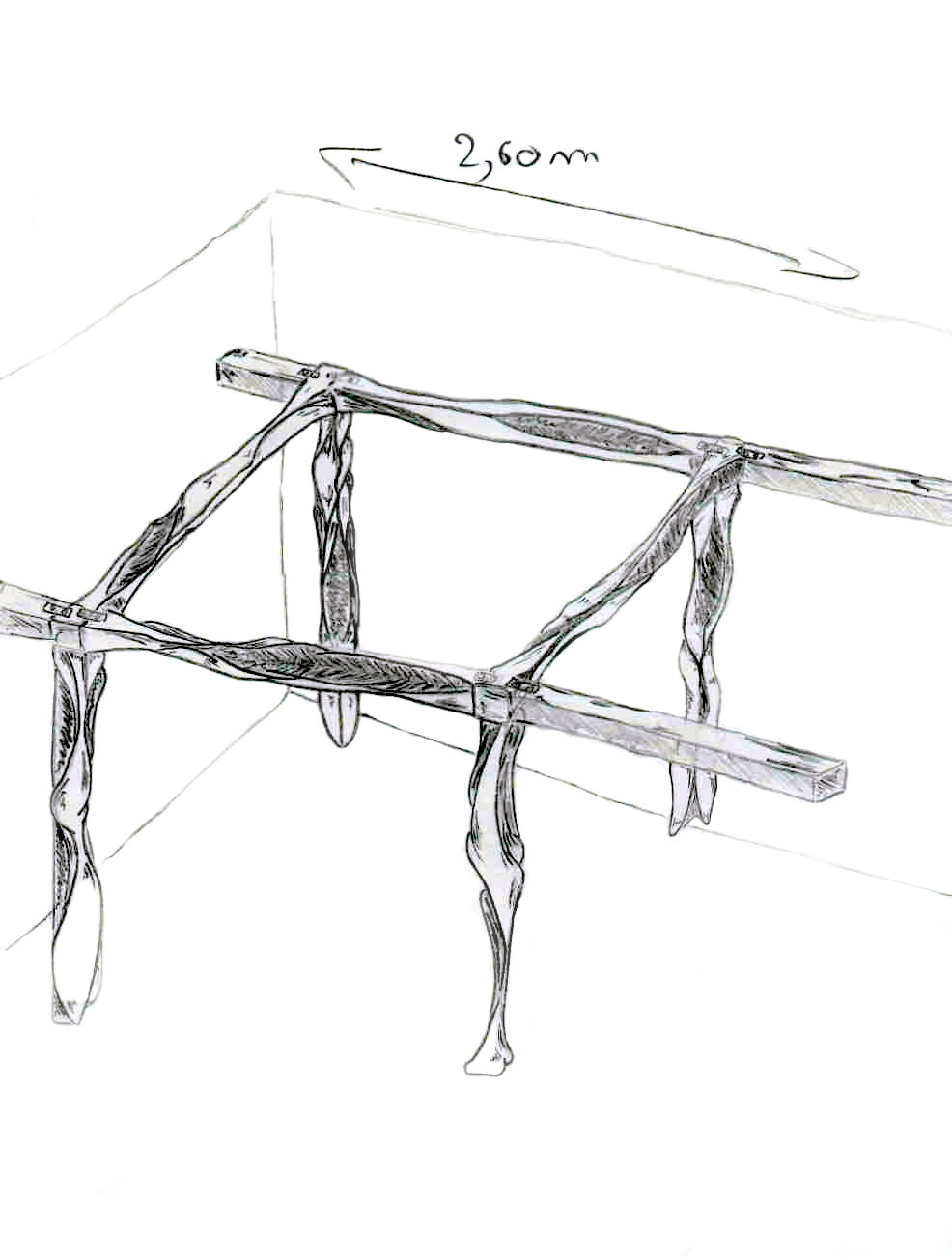 Je suis parti d’un volume de matière, des pièces en bois creusées à l’aide d’un ciseau. En suivant les lignes du bois, en faisant reparaître les fibres qui le constitue, je produisais un sillage à la rencontre des abords de la surface lisse de la charpente. Placés dans l’espace, elles tentent de se maintenir au seuil de la structure du lieu qui les accueille.